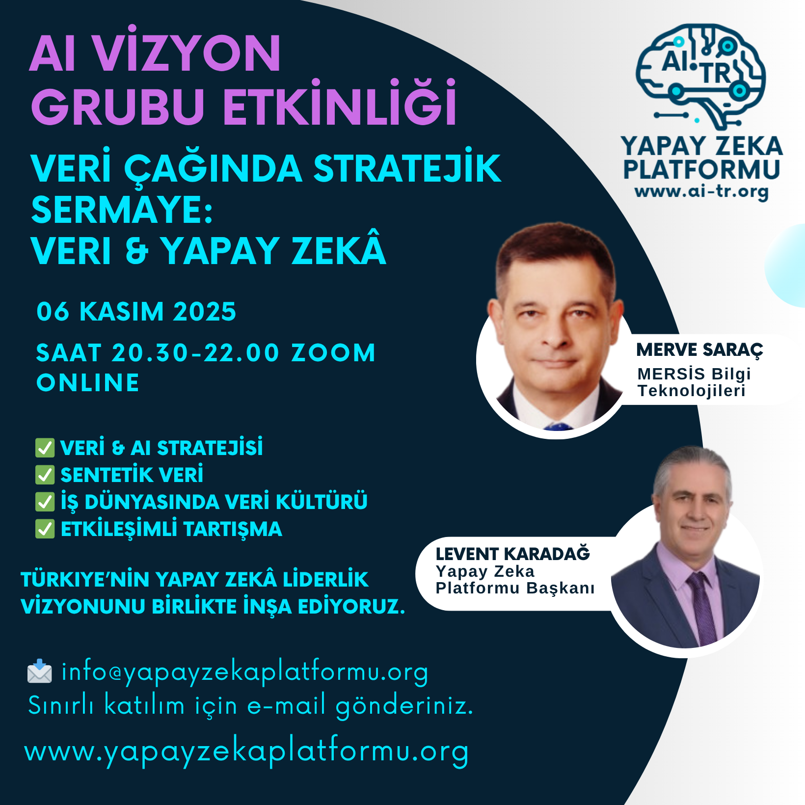 AI Vizyon Grubu; Türkiye’de iş dünyası, kamu ve akademi liderlerini bir araya getirerek ulusal yapay zekâ dönüşümüne yön veren stratejik bir platformdur. Amaç; kurumların rekabet gücünü artırmak, sürdürülebilir AI stratejileri geliştirmek ve Türkiye’yi yapay zekâ üreten ülkeler ligine taşımaktır. Bu topluluk, vizyon paylaşımı, stratejik iş birliği ve uygulamalı dönüşüm projeleri ile geleceğin liderlerini bir araya getirir.
