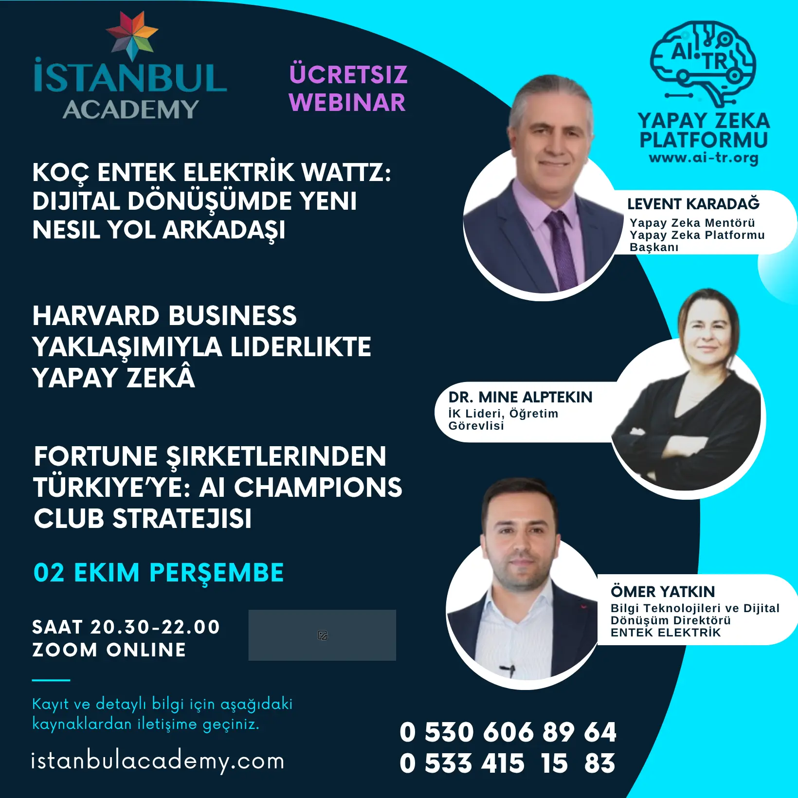 Türkiye’nin iş dünyası, kamu ve akademi ekosisteminde yapay zekâ liderliğini geliştirmek; kurumlara stratejik yön çizmek, AI dönüşüm projelerini hızlandırmak ve geleceğin yetkinliklerini topluma kazandırmak.
